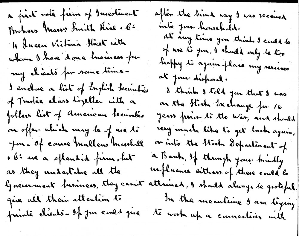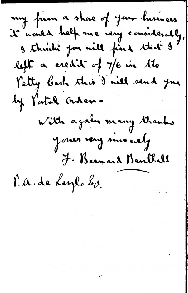 Letter from F. Bernard Benthall thanking de László for sending a cheque following a financial loss. He thanks the artist for receiving him into his household and would be happy to be of use again in the future. Benthall would like to return to work in the City and would be grateful if de László could help. In the meantime, if the artist could give his firm some business he would be most grateful