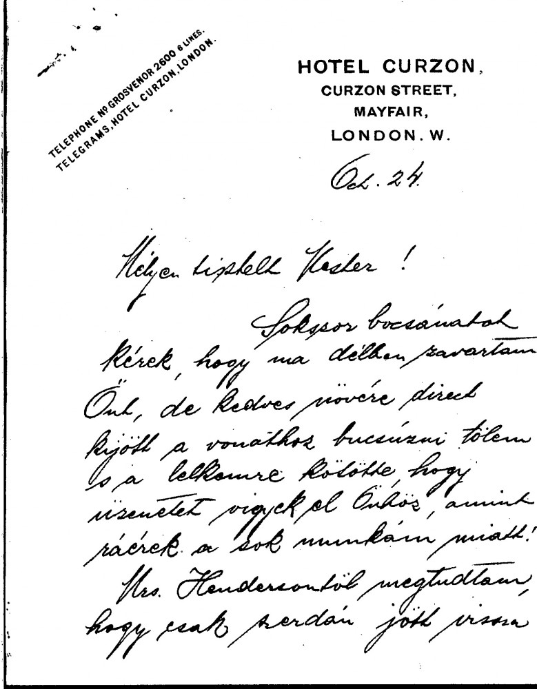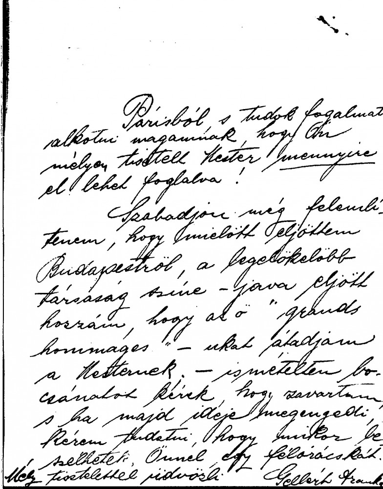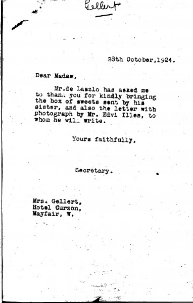 Multiple letters, letter dated 28 October 1924 from de László's secretary thanking Aranka Gellért for bringing a gift from his sister and for a letter and photograph of Aladár Edvi Illés. Letter dated 24 October 1924 from Aranka Gellért regarding a message that de László's sister asked her to pass on. Aranka also writes that "the cream of the most distinguished [Budapest] society came to me to ask me to convey their 'grands homage' to you"