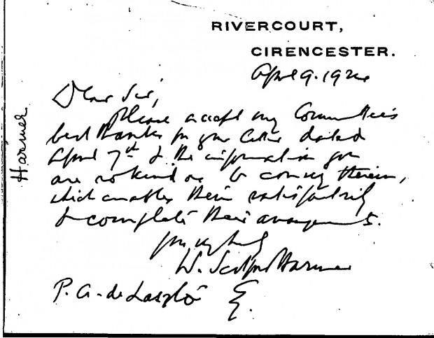 William Scotford Harmer's committee thanks de László for supplying the information necessary to complete their arrangements