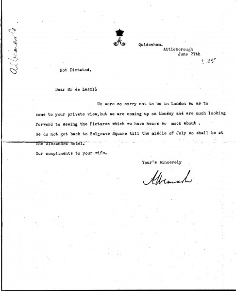 Earl Albemarle sends his regrets that he was unable to attend the artist's private view at the French Gallery, but he is looking forward to seeing the pictures when he comes to London
