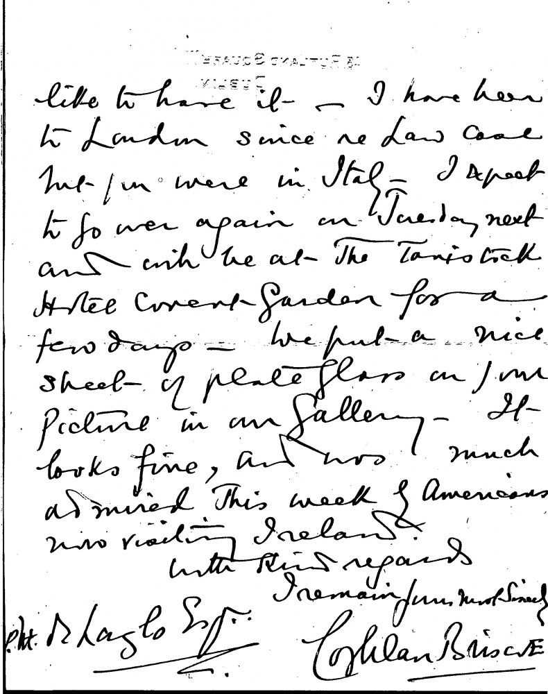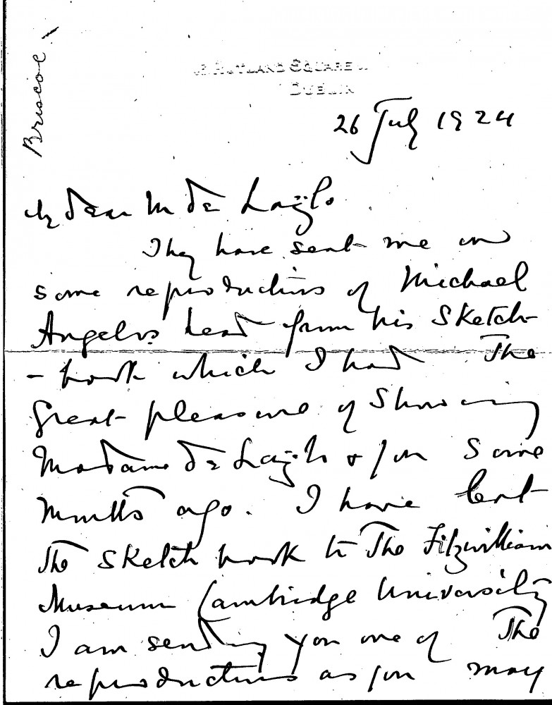Letter from Coghlan Briscoe to de László enclosing reproductions from the Michelangelo sketchbook he has lent to the Fitzwilliam Museum. He writes of a recent visit to London and a planned future trip. They have put a sheet of plate glass on de László's picture in the gallery [presumably 5617] and it was "much admired ... by Americans now visiting Ireland"