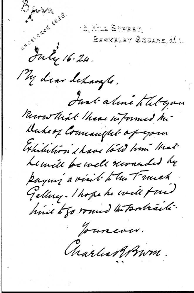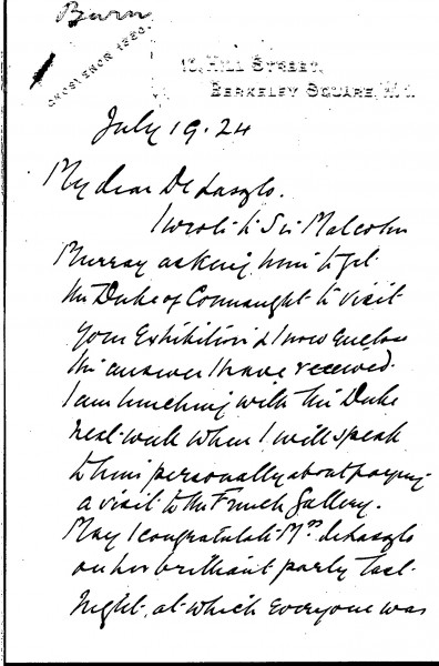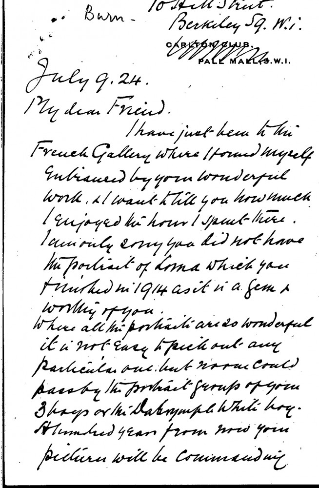 Multiple letters from Charles Burn (later Sir Charles Rosdew Forbes-Leith) to de László, all dated July 1924 and concerning the artist's exhibition at the French Gallery. Letter dated 9 July, Burn praises the exhibition, but was sorry the portrait of his daughter Lorna [9819] was not exhibited. Burn singles out for particular praise the portrait of the three Laszlo boys [5245] and a portrait of Dalrymple-White [4629]. "A hundred years from now your pictures will be commanding the prices now obtained for Reynolds, Romney or Raeburn’s work", he writes. Letter dated 16 July, Burn has informed the Duke of Connaught about the exhibition. Letter dated 19 July, Burn encloses the answer from the Duke of Connaught