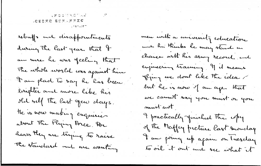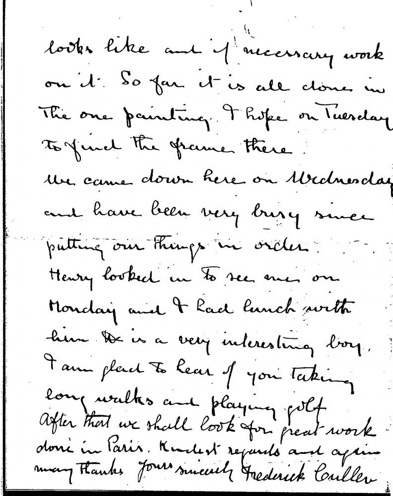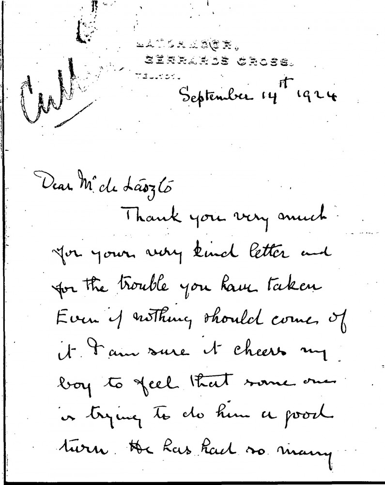 Letter from Frederick Cullen thanking de László for evidently offering to help his (Cullen's) son. Cullen has almost finished the Maffey copy portrait [111160] and he mentions finding a frame for it. He is glad to hear that de László has been taking long walks and playing golf
