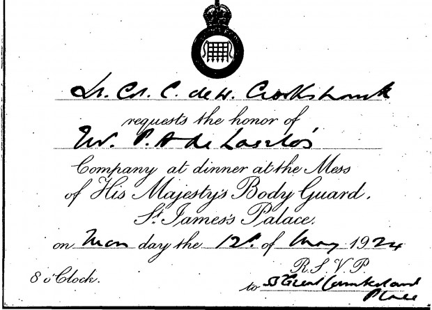 Invitation to dinner at the mess of his Majesty’s Body Guard from Colonel Chichester de Windt Crookshank