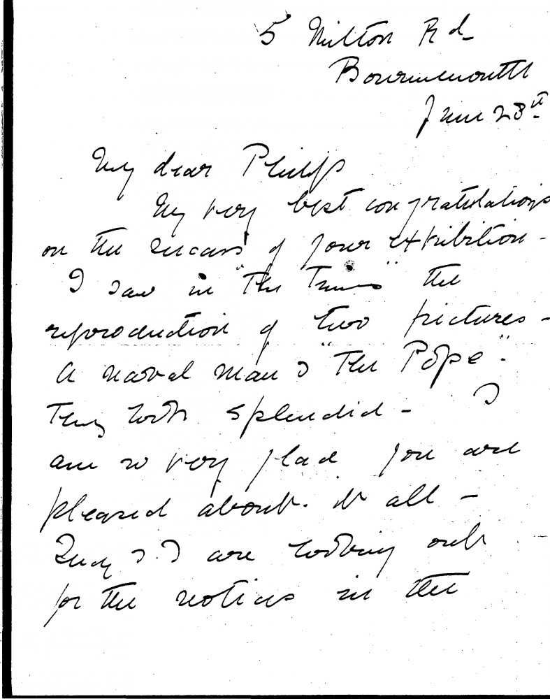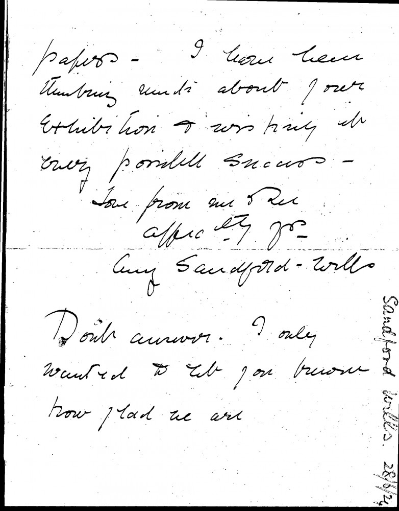 Letter from Mrs Amy Wills-Sandford-Wills congratulating de László on his exhibition at the French Gallery. She saw the reproductions of [5990] and [6690] in The Times