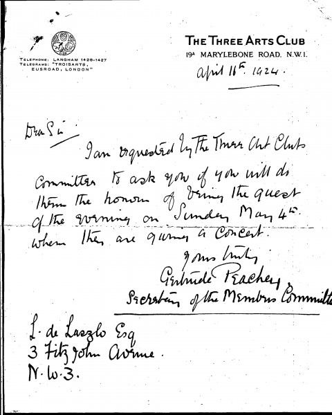 Letter from Gertrude Peachey inviting de László to be the guest of honour at a concert given by The Three Arts Club