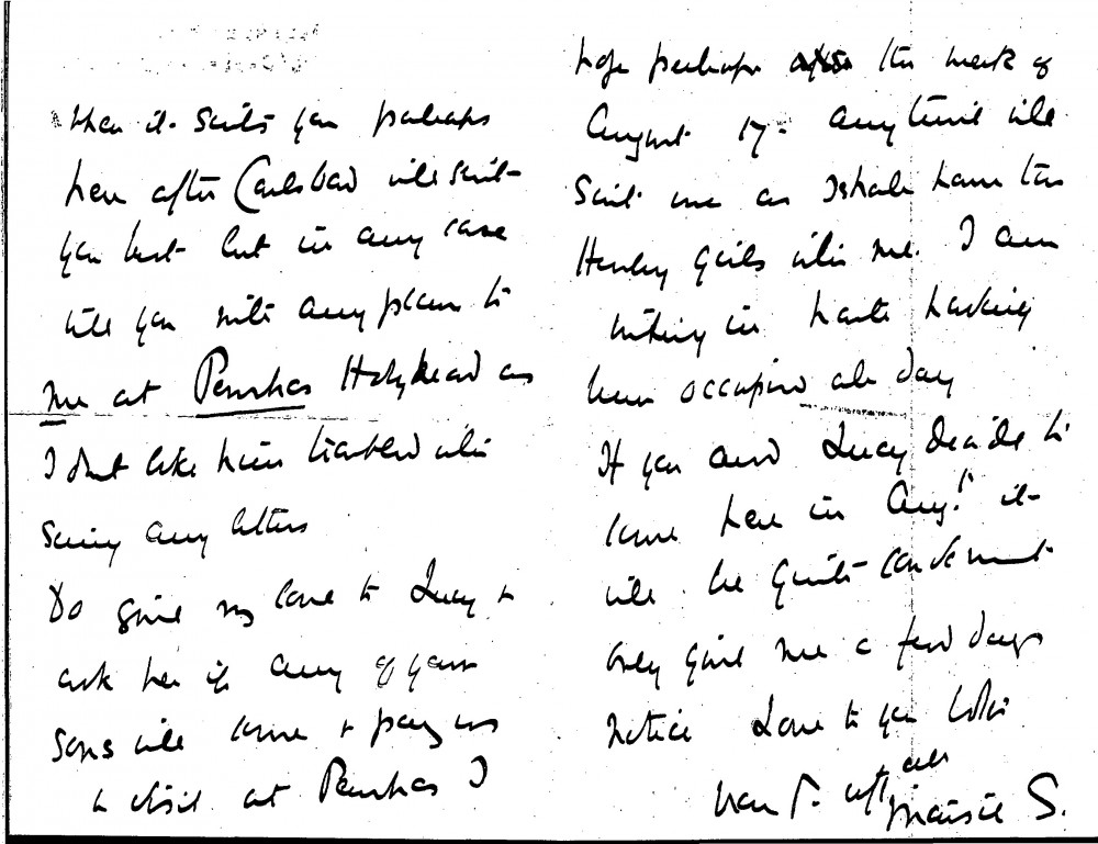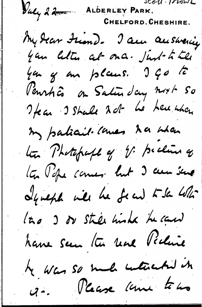 Lady Sheffield writes to de László to say that she will not be in Alderley Park when her portrait [2770] nor that of the Pope [6690] (the latter a reproduction) arrives. She invites the artist to visit