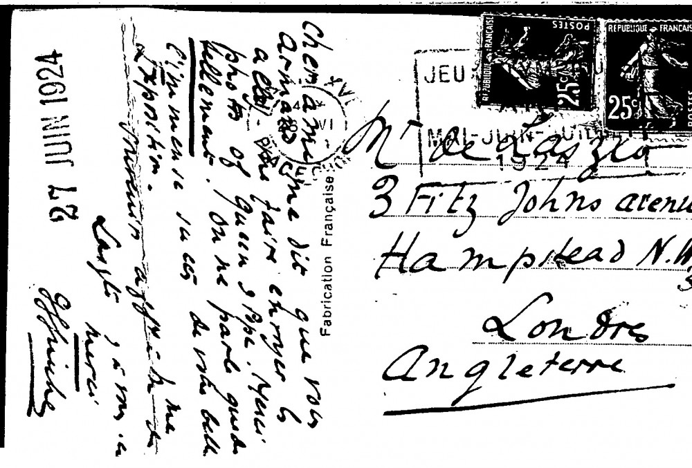 Postcard from the duchesse de Gramont regarding photographs of the Queen [possibly 3200] and Pope [possibly 6690]. She notes that everyone is talking about the success of de László's exhibition at the French Gallery (item was previously archived with DLA015-0075)