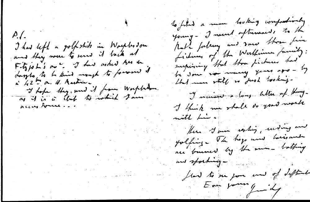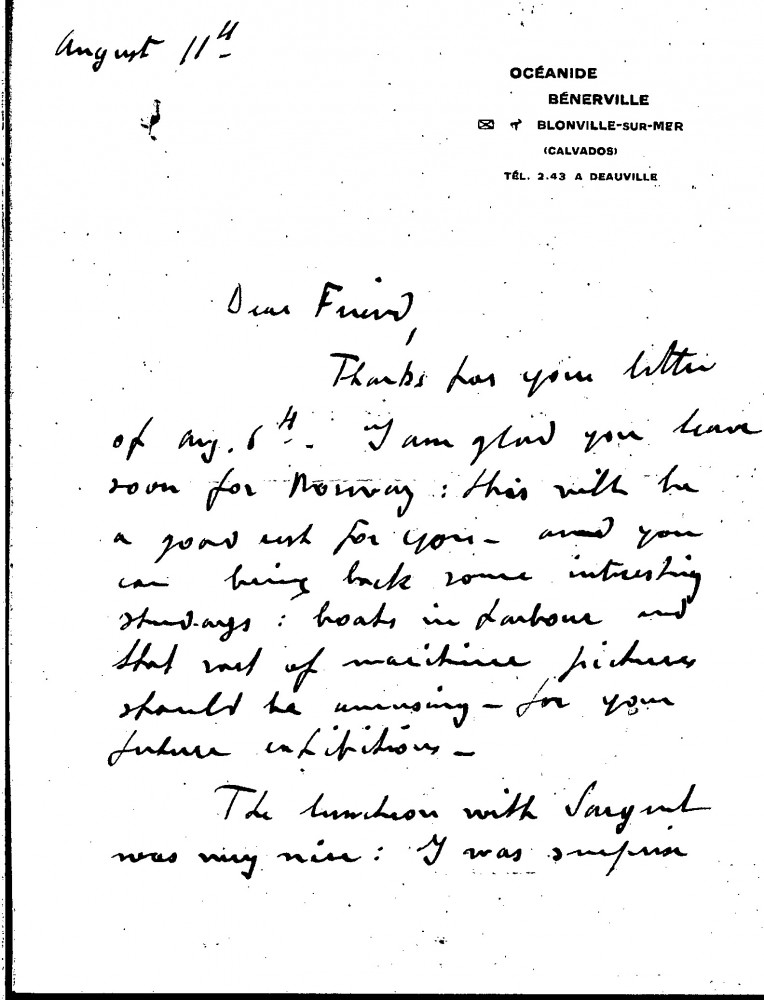 The duc de Guiche, writing from his holidays in Calvados, is glad to hear that de László will soon depart for Norway; he will benefit from the rest and can paint some maritime pictures. He recently had lunch with Sargent, who looked "comparatively young" and "fresh" notwithstanding his age. After lunch, he saw Sargent's Wertheimer portraits. The duc left a golf club at Worplesdon (item was previously archived with DLA015-0075)