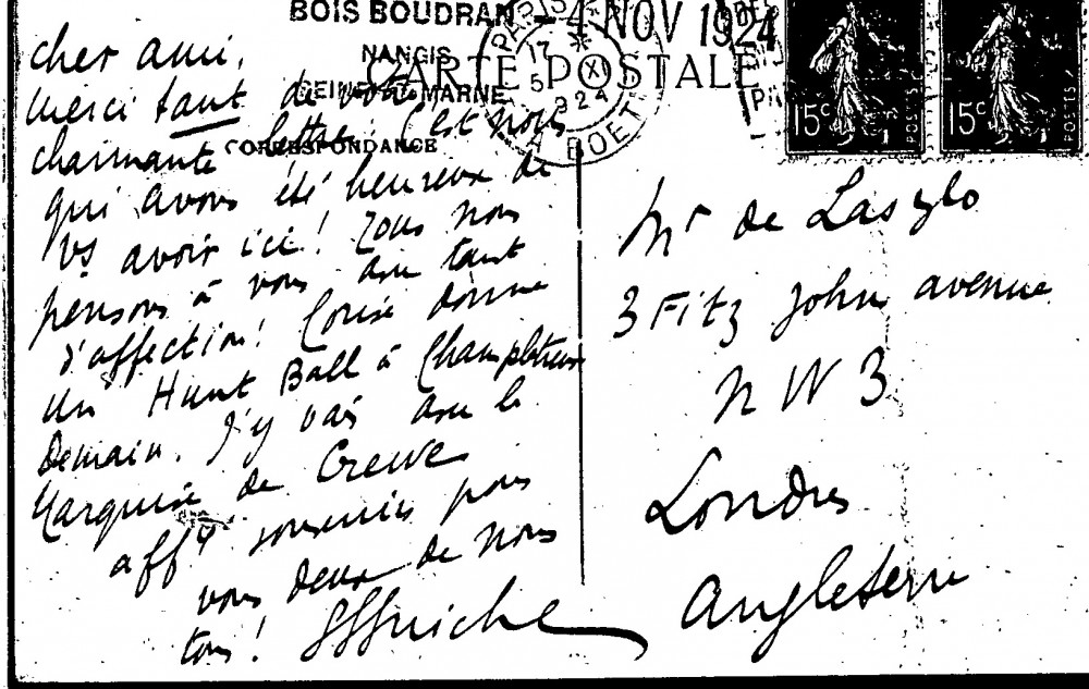 Postcard from the duchesse de Gramont thanking de László for a letter in which he thanked the duchesse for his stay in the avenue Henri Martin apartment (item was previously archived with DLA015-0075)