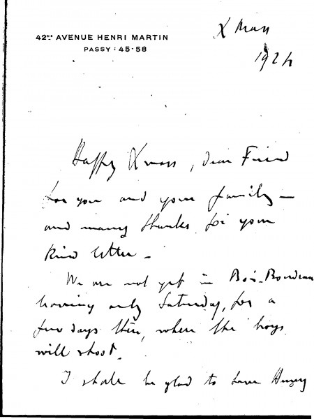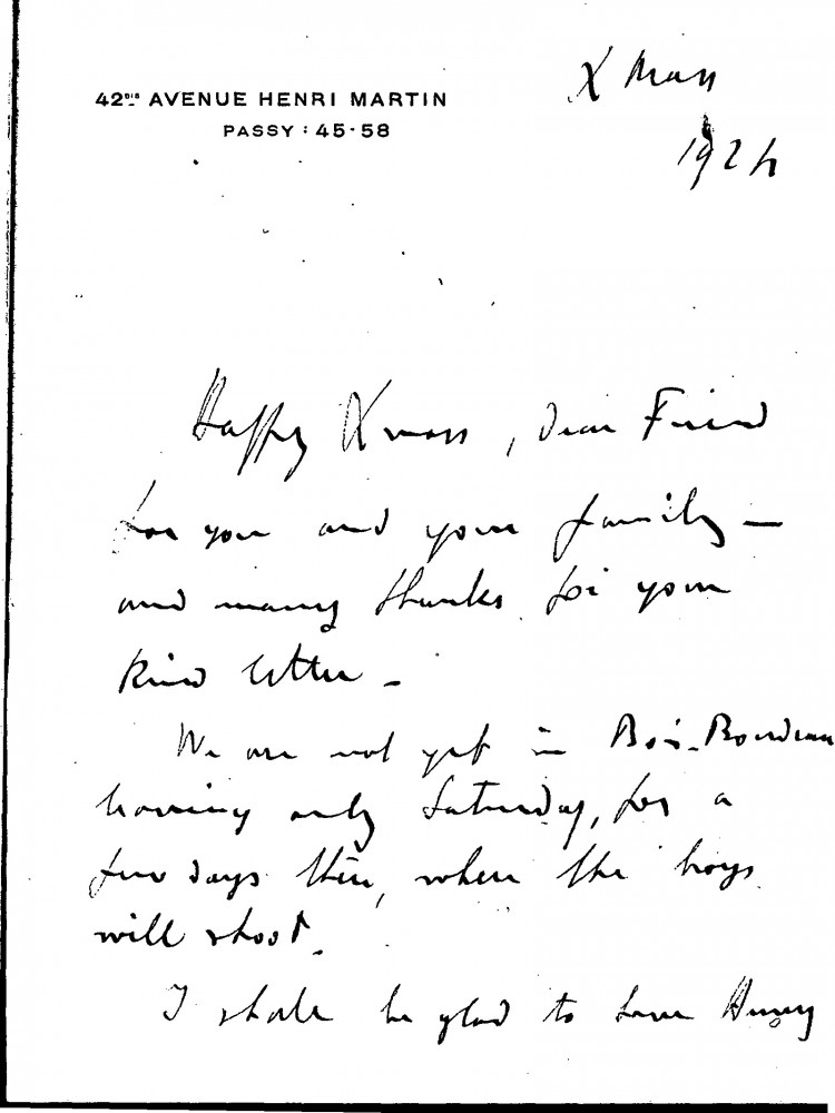 The duc de Guiche wishes de László a happy Christmas; he mentions his and de László's holiday plans. He is glad that Henry de Laszlo will visit. Miguel de Yturbe would like de László to paint his "good looking" daughter when he arrives in Paris (item was previously archived with DLA015-0075)