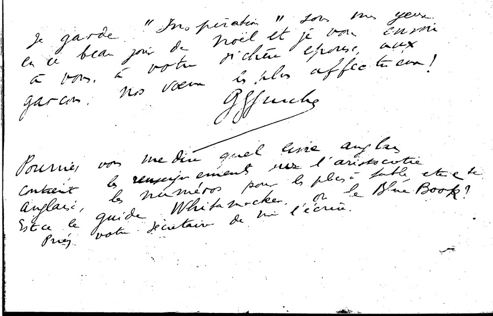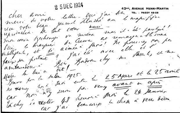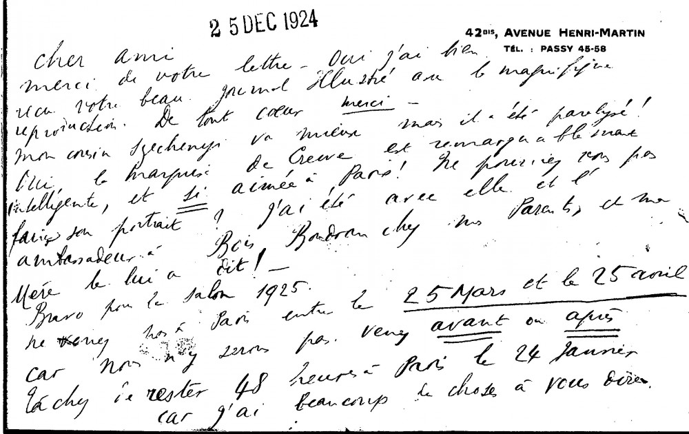 The duchesse de Gramont thanks de László for sending her an illustrated newspaper. Her cousin Szechenyi's health has improved. The duchesse's mother told the Marquise de Creuse, who is "remarkably clever and so much loved in Paris", that de László would paint her portrait. She congratulates the artist on the 1925 salon and lets him know when he should come to Paris in the new year (item was previously archived with DLA015-0075)