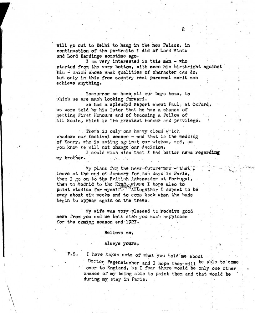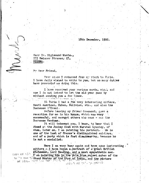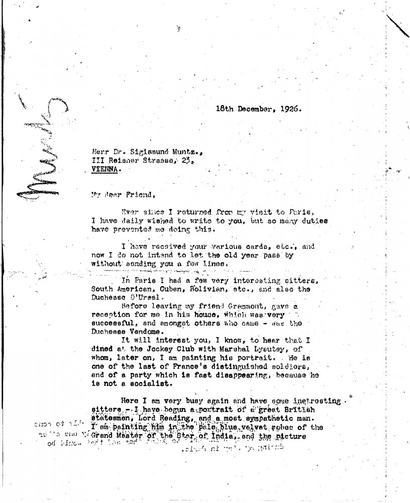 Letter from de László to Sigmund Münz largely regarding recent and forthcoming sitters, e.g. Duchesse d'Ursel [4969]; Maréchal Lyautey [6118]; Lord Reading [6747]. He will travel to Portugal and Spain in January/February 1927. He hopes Dr and Frau Pagenstecher will come to England to have their portraits painted. He mentions his delight over Paul's university results and his disappointment over Henry's forthcoming nuptials