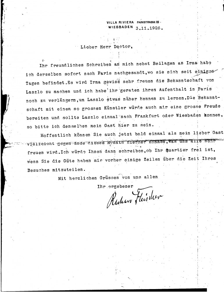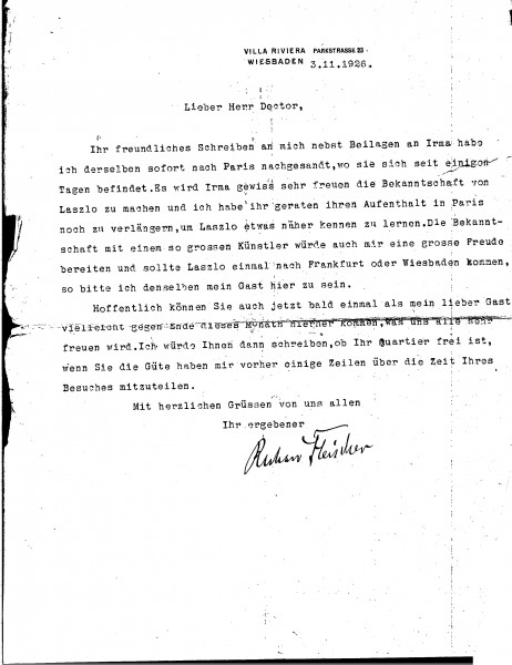Letter from Richard Fleischer to Sigmund Münz outlining that Irma Pagenstecher (Fleischer's stepdaughter) is in Paris where she will meet de László. Fleischer has told Irma to stay longer so as to get to know the "great artist" better. If de László ever comes to Frankfurt or Mainz, Fleischer would be happy to have him stay at his house as his guest. This letter and DLA016-0004 were enclosed by Münz in DLA016-0005