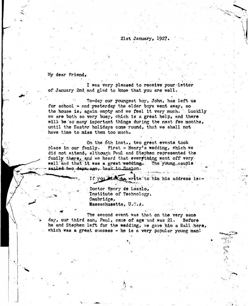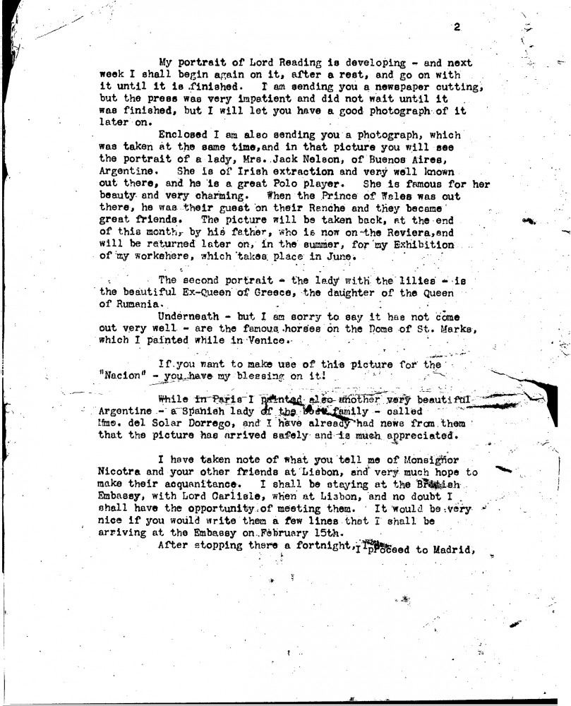 Letter from de László to Sigmund Münz containing both family and work-related news. Henry recently got married (to Violet Staub). Paul came of age and a ball was given in his honour. He encloses a newspaper cutting on his portrait of Lord Reading [6747], a photograph of Lily MacDonald de Nelson's picture [110536], a portrait of the Queen of Greece [3270] and a Venetian landscape [11636]. He painted Laura Pacheco de del Solar Dorrego whilst in Paris [110545]. The letter finishes with his Lisbon travel plans