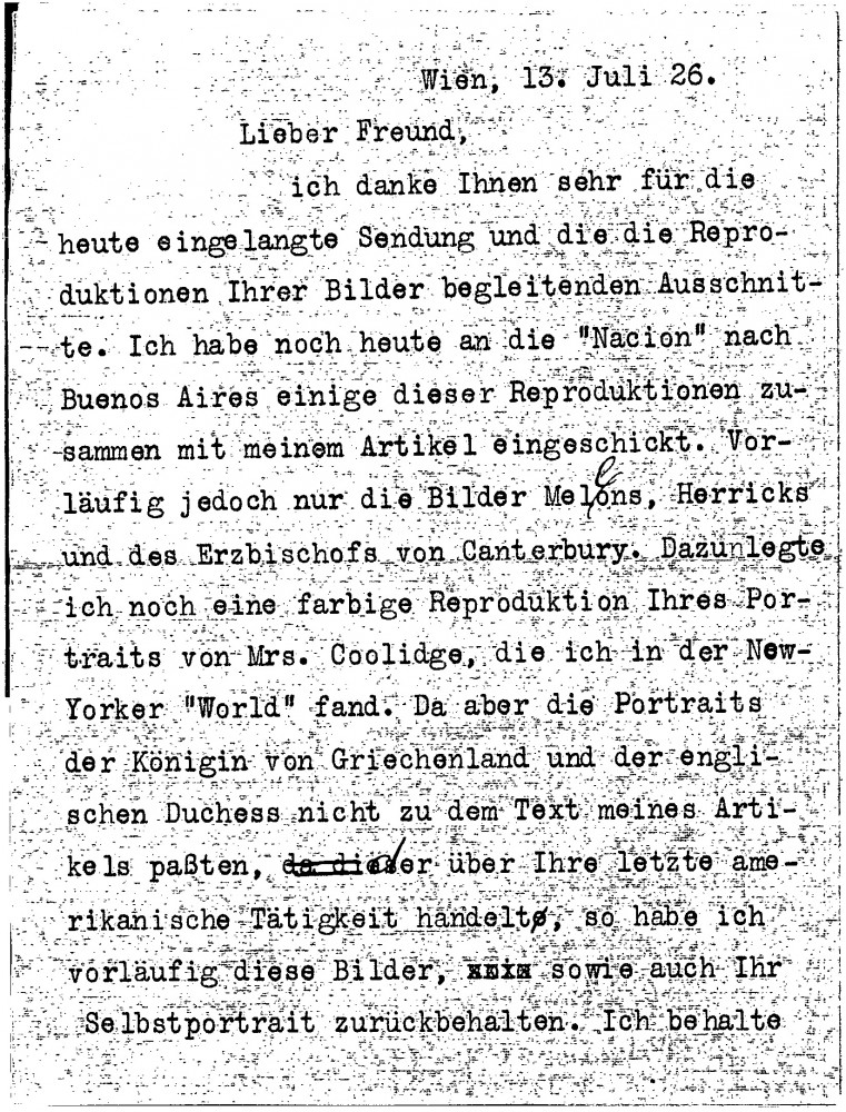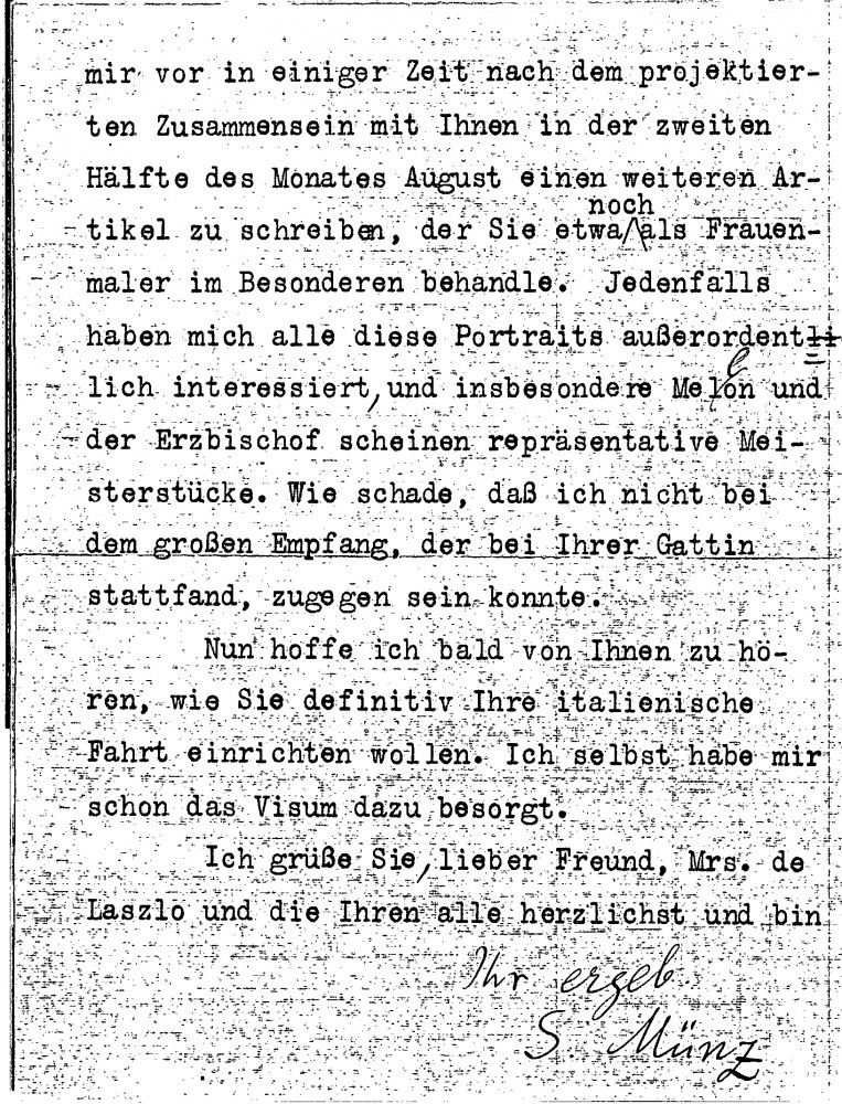 Sigmund Münz has sent reproductions of Mellon [6418], Herrick [possibly 5601], the Archbishop of Canterbury [4632] and Mrs Coolidge [4171] to the "Nacion" with his article; he has kept aside the Queen of Greece [possibly 3270] and the self portrait. He plans to write another article about de László as a painter of women. De László should let him know about the Italian trip (DLA016-0024 was previously archived with this item)