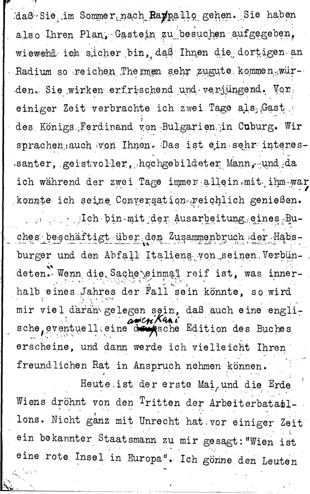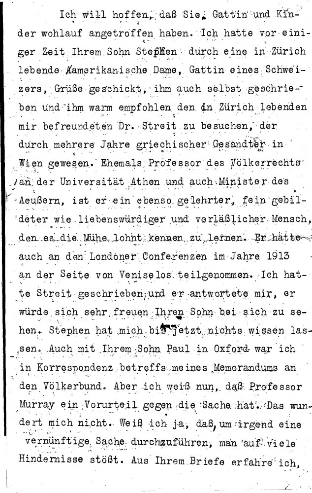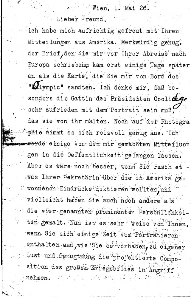 Sigmund Münz thanks de László for the news from America; he will publish the artist's impressions and asks if he will supply more. He commends him for concentrating on his war-painting. He has written to Stephen in Zurich and has told him to contact Dr Streit. He has also contacted Paul in Oxford regarding a memorandum for the League of Nations. Münz was recently guest of King Ferdinand of Bulgaria. He is preparing a book about the decline of the Habsburgs. He has not heard about the artist's memoirs for a long time