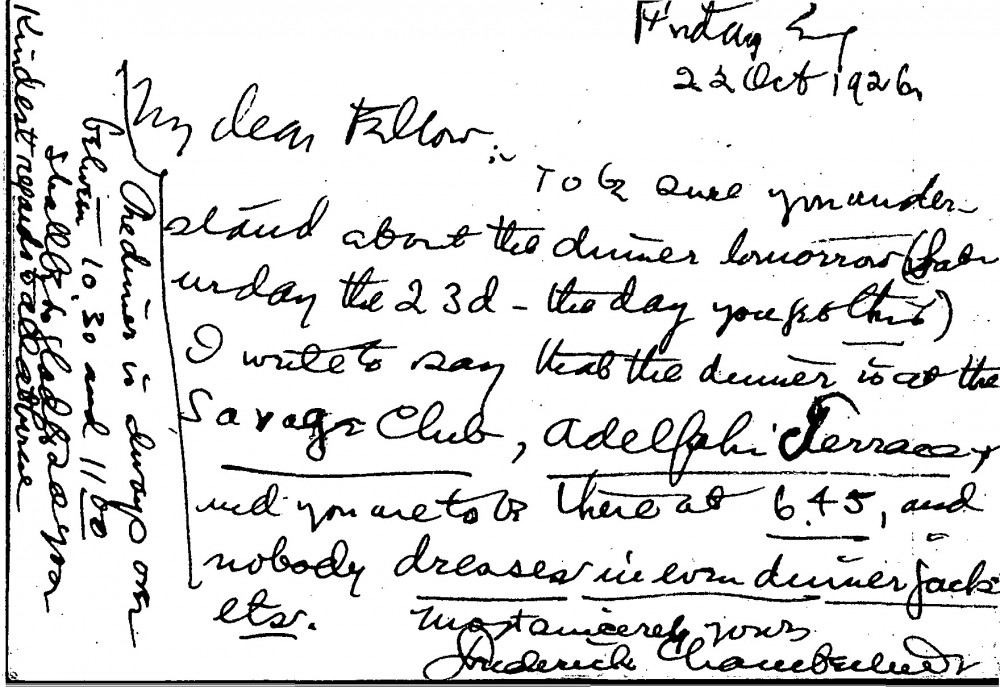 Postcard from Frederick Chamberlin to de László regarding a forthcoming dinner at the Savage Club