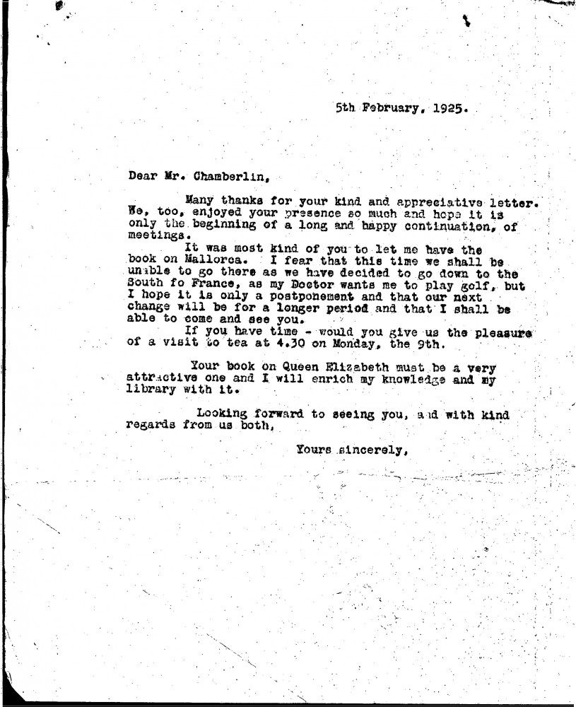 De László thanks Frederick Chamberlin for the latter's appreciative letter (see DLA016-0026), his guide to Mallorca and book on Queen Elizabeth. He will not be able to visit Mallorca as he is going to the South of France to play golf on the doctor's orders. He invites Chamberlin to tea