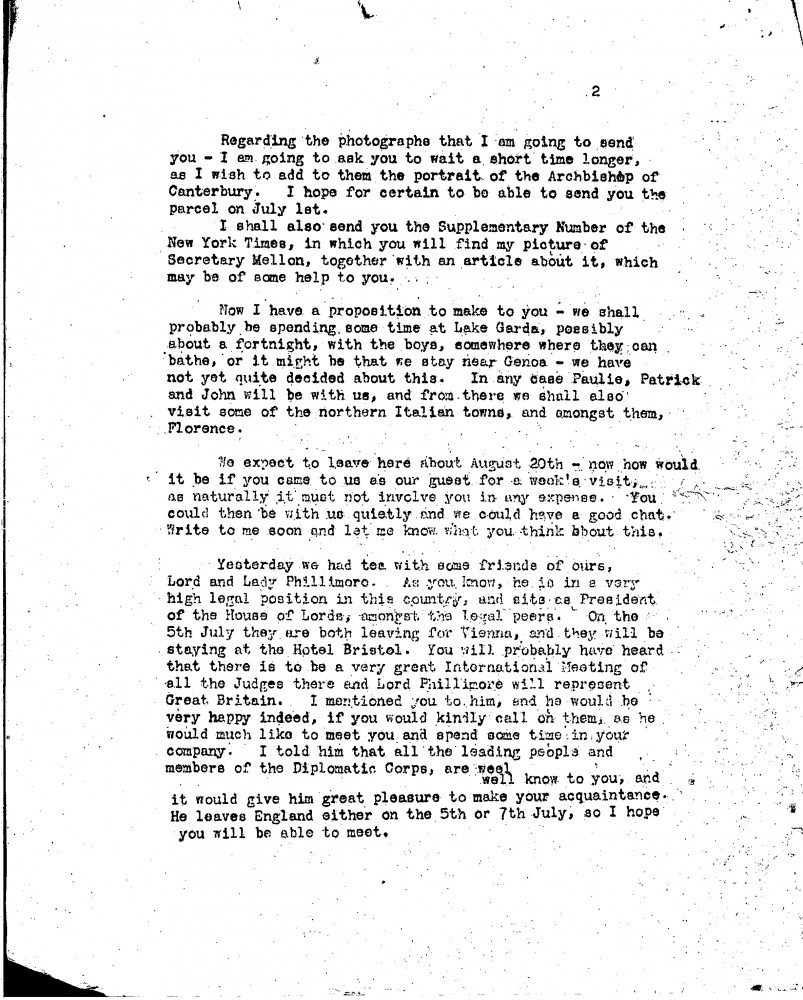 Münz can leave his article as is, but should add that de László has recently finished the Archbishop of Canterbury's portrait [4632] from which he derived much satisfaction owing to its historical significance. De László will send a parcel of photographs and a New York Times Supplement on his Mellon portrait [6418]. He mentions his travel plans to Italy with his family and suggests Münz join. He asks Münz to call on Lord and Lady Phillimore who will soon be travelling to Vienna