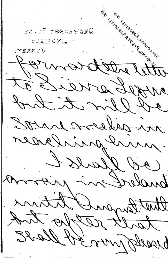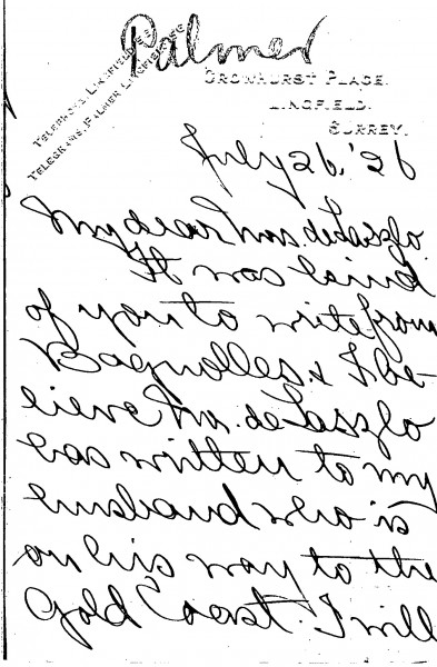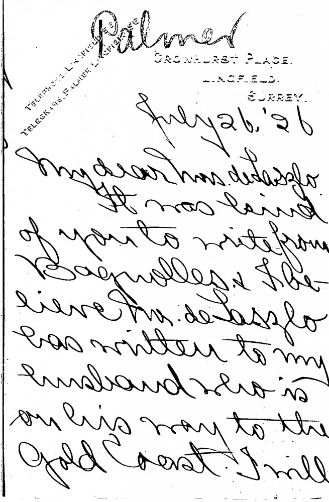 Florence Palmer thanks Lucy for her letter. De László's letter to her husband, Frederick Palmer, will take some time to reach him as he is on his way to the Gold Coast. She mentions a future meeting