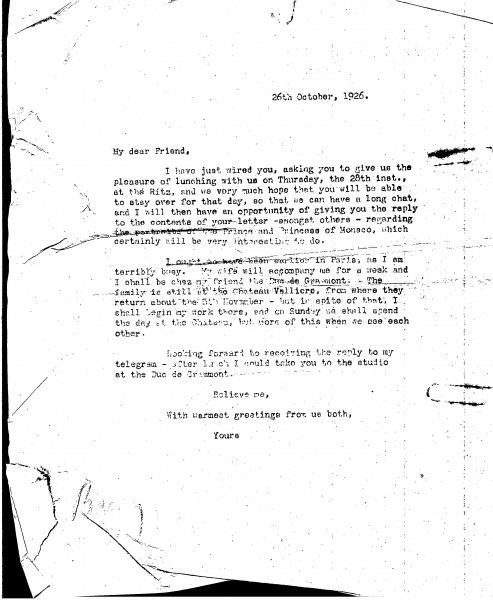 Letter from de László to an unidentified recipient inviting them to lunch at the Ritz in Paris to discuss, amongst other things, potential portraits of the Prince and Princess of Monaco. The artist's travel/accommodation plans whilst in France are included