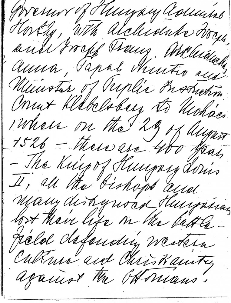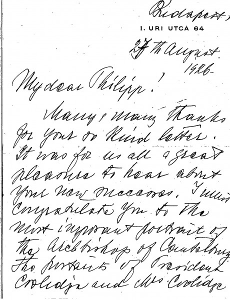 Partial letter, possibly continues as DLA016-0052, see "Editorial Notes". István Bárczy de Bárcziháza congratulates de László on his recent successes and lists a number of the artist's important portraits. He will attend an event to commemorate the Battle of Mohács