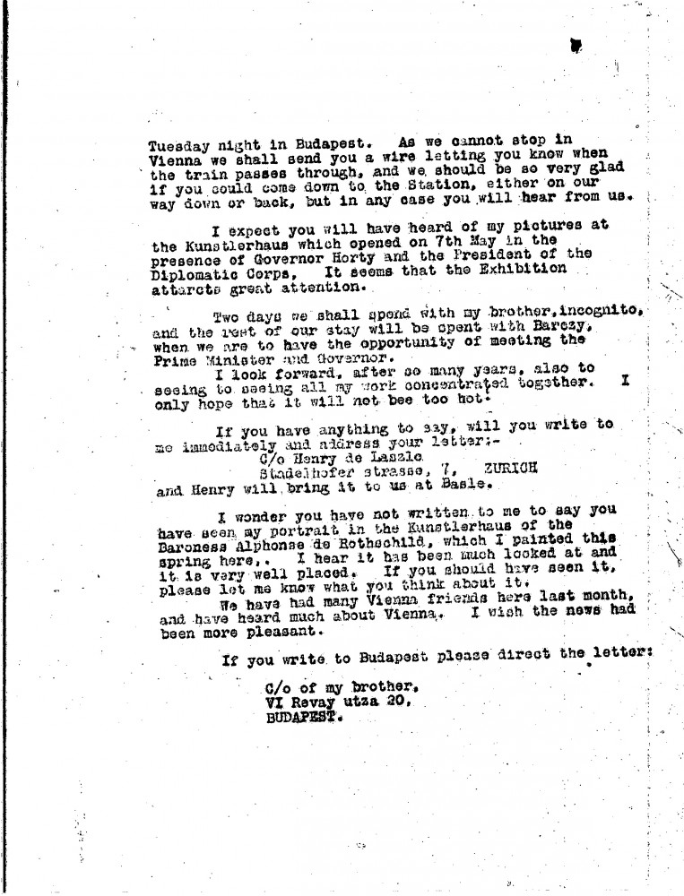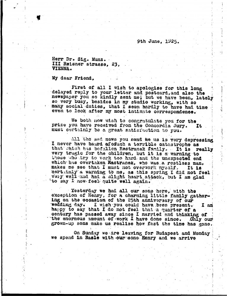 De László congratulates Münz on Concordia Jury prize. Comments on sad fate of Kestranek family, which should act as warning not to overwork oneself; mentions scare of recent “slight” heart attack. Refers to his 25th wedding anniversary. Remainder of letter concerns travel plans for Budapest via Basle & exhibitions. Asks Münz's view of Baroness de Rothschild's portrait [4616] at Vienna Kunsterhaus