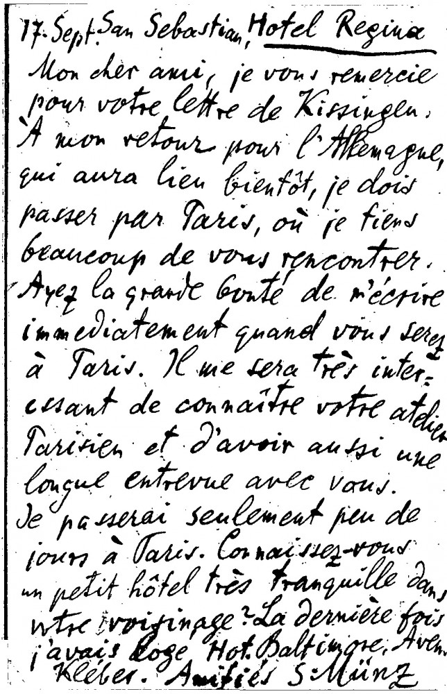 Sigmund Münz would like to meet de László in his studio in Paris on his way back to Germany