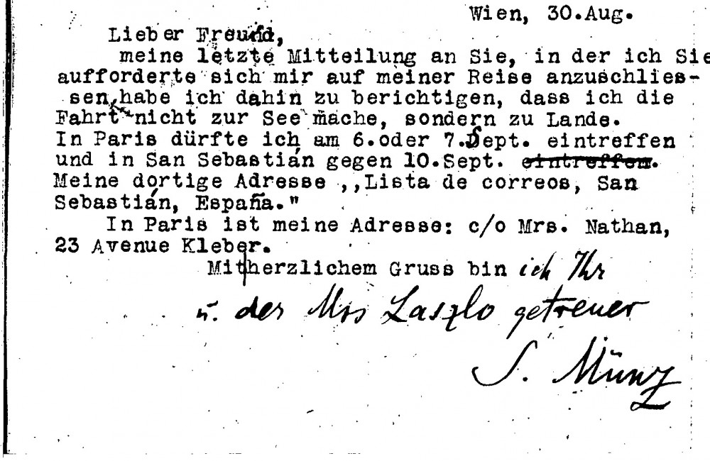 Sigmund Münz will now travel overland and not by sea; he gives the dates during which he will be in Paris and San Sebastián and his address for the former
