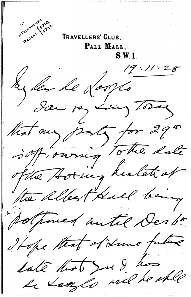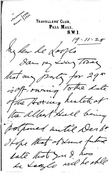 Captain Eric Walter Harbord apologises that his party, originally scheduled for 29th November, must be postponed due to the boxing match's date being moved to 6th December. He looks forward to de László's party, which also happens to be on 6th December