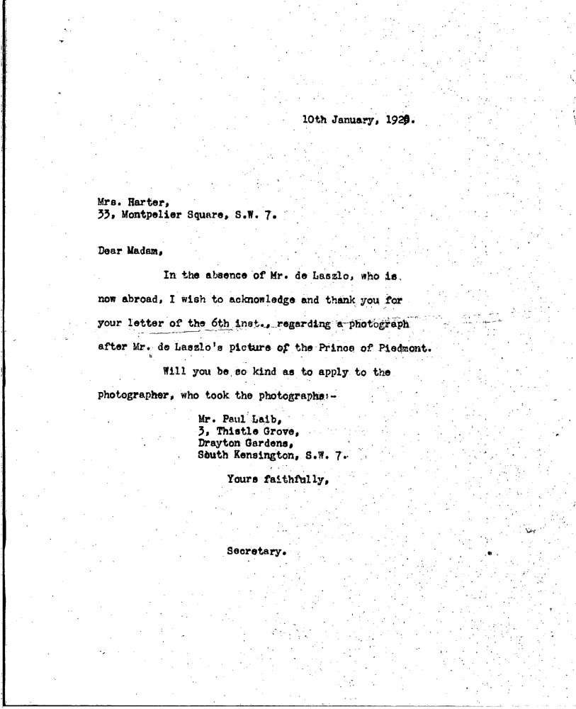 In response to Ethel Maud de Fonblanque's request for a photograph of the Prince of Piedmont's portrait [7890 or 9813] (see DLA016-0078), de László's secretary suggests she contact Paul Laib