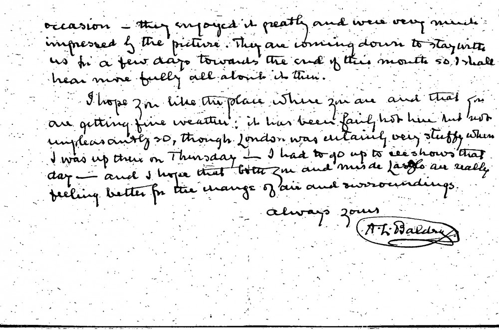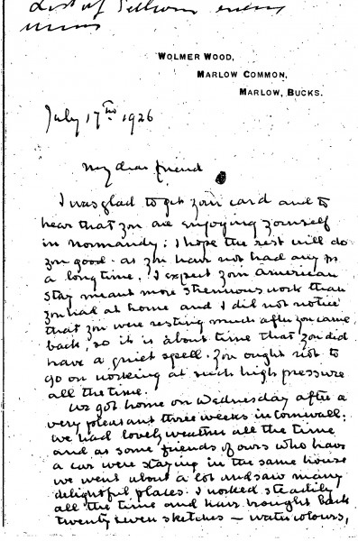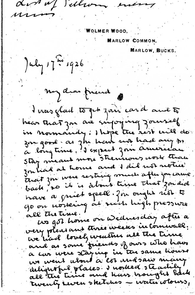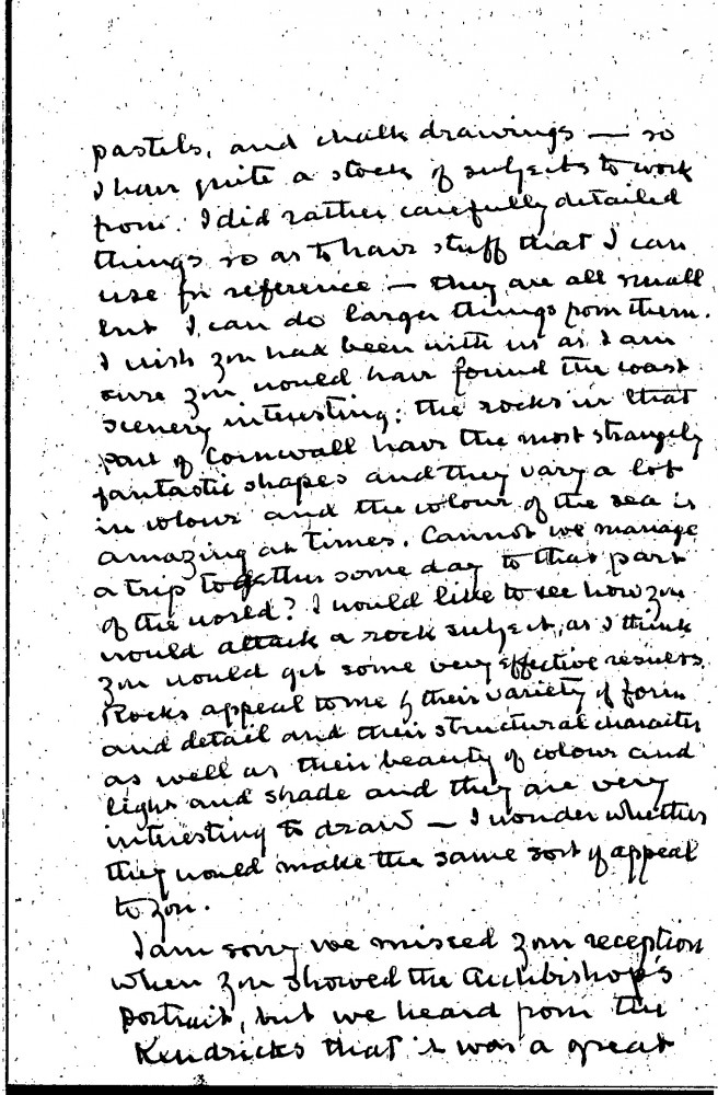 Alfred Baldry is happy de László is resting in Normandy following his time in America. The remainder of the letter largely concerns Baldry's trip to Cornwall and the sketches he undertook there. He apologises for missing the unveiling of the Archbishop's portrait [4632]