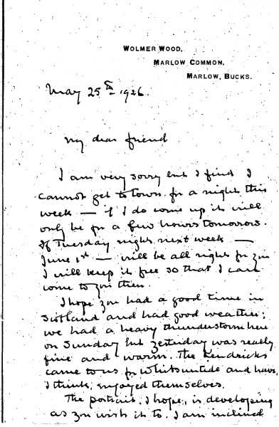 Letter from Alfred Baldry concerning arrangements to visit de László. Reference to a portrait (likely [4632]), which Baldry predicts may be one of the artist's greatest successes