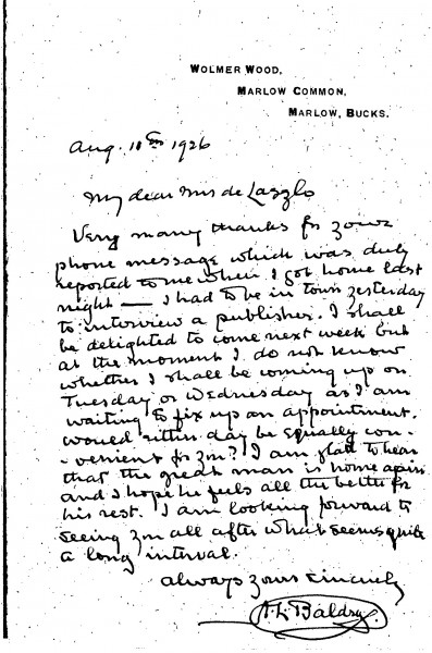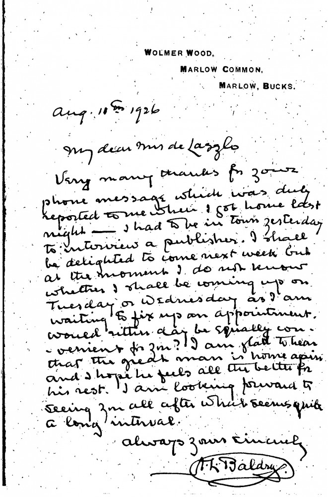 Letter from Alfred Baldry to Lucy regarding a visit. He hopes de László feels better after his rest