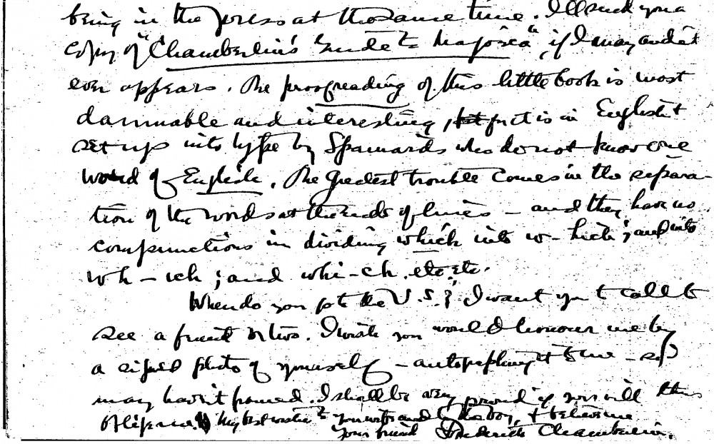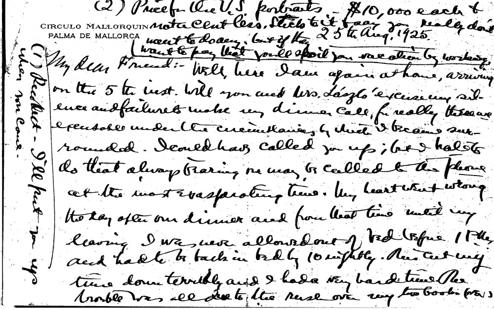 Frederick Chamberlin apologises for failing to make dinner–he was taken ill due to stress over the simultaneous publication of two of his books. He requests a signed photograph of de László. He suggests the artist charge $10,000 per U.S. portrait and "not a cent less"