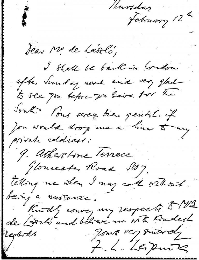 Letter from Ferdinand L. Leipnik regarding an appointment with de László