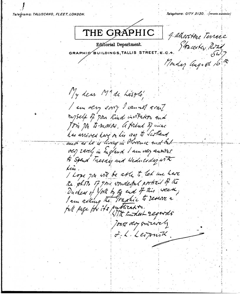 Ferdinand L. Leipnik cannot join de László tomorrow. He requests a photograph of the artist's portrait of the Duchess of York [4460] for publication in "The Graphic"