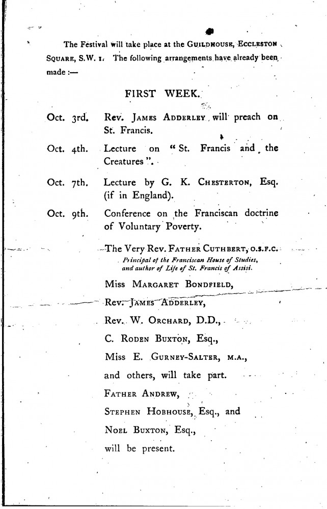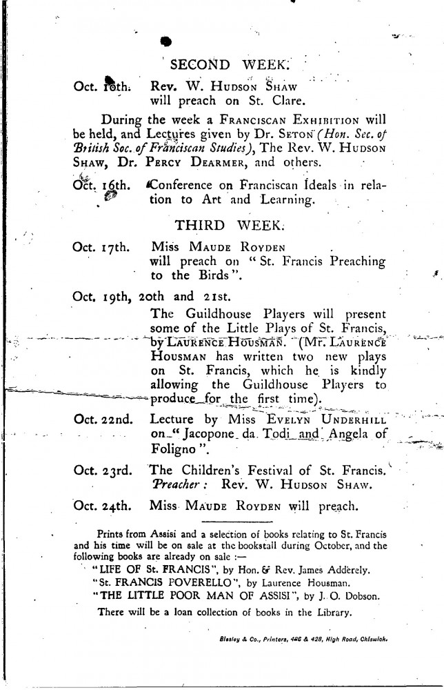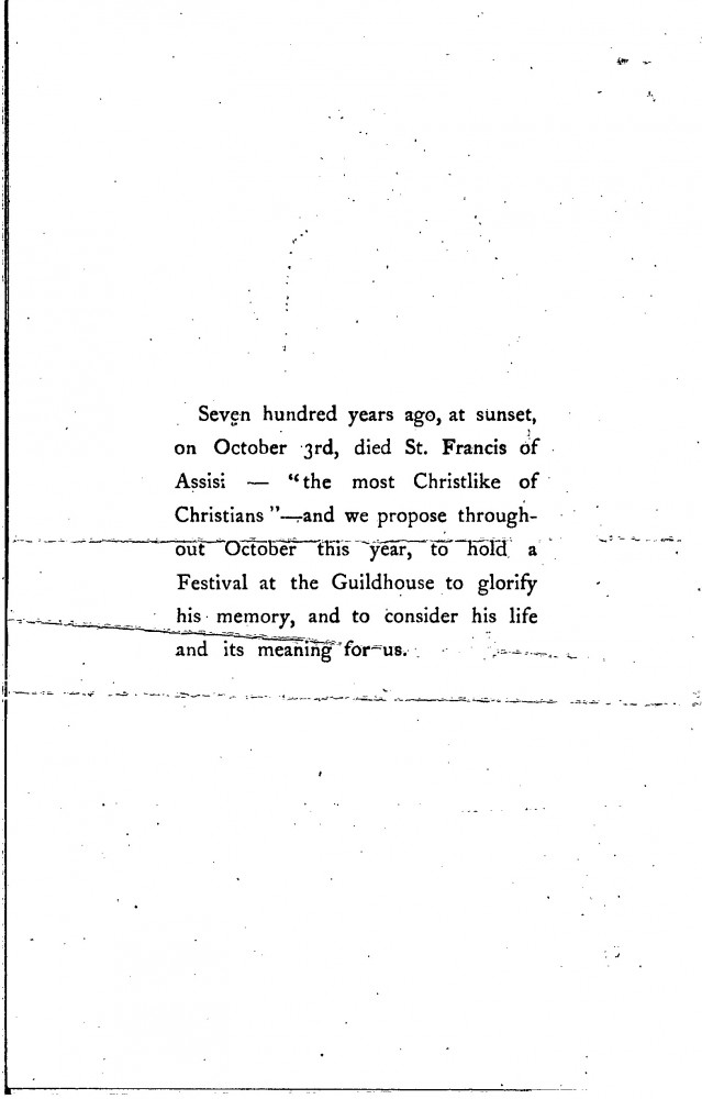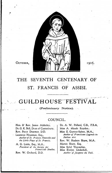 Preliminary notice and leaflet for the Guildhouse's Festival celebrating the Seventh Centenary of St. Francis of Assisi's death, which was to include a lecture by Doctor Agnes Maude Royden (who later sat to de László [6809])