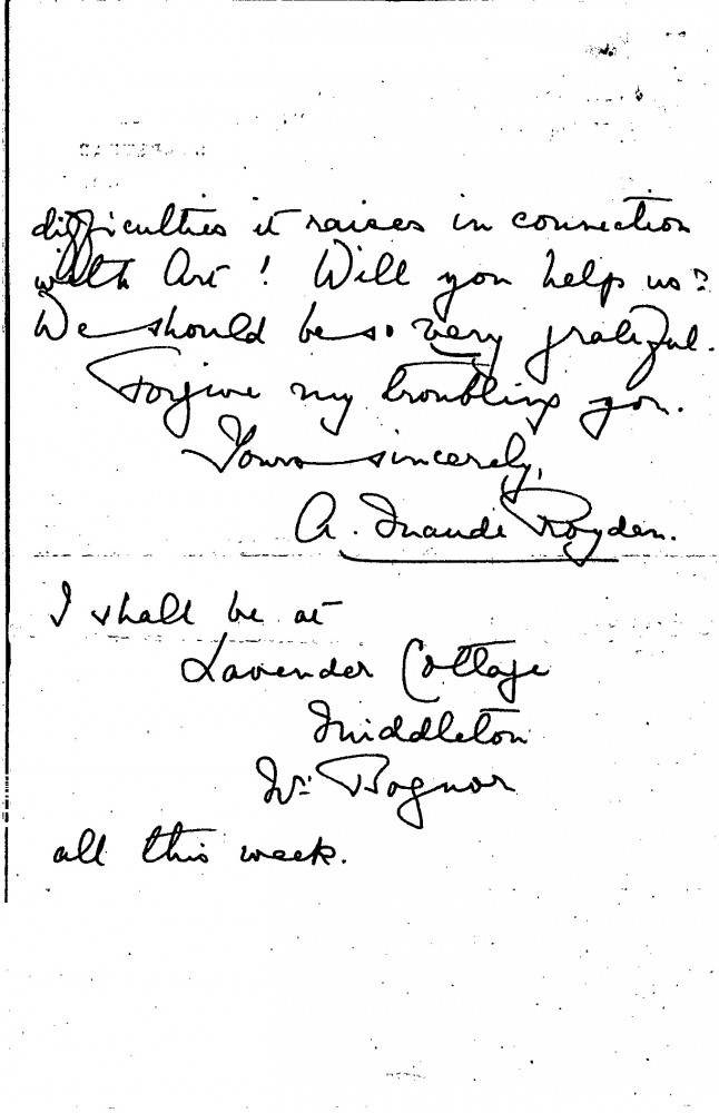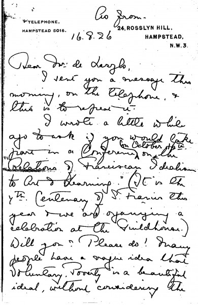 Doctor Agnes Maude Royden contacts de László again (see also DLA016-0123) to see whether he will take part in a conference on the "Relations of Franciscan Idealism to Art & Learning", which was to be held as part of the Guildhouse Festival's Seventh Centenary of St. Francis of Assisi's death