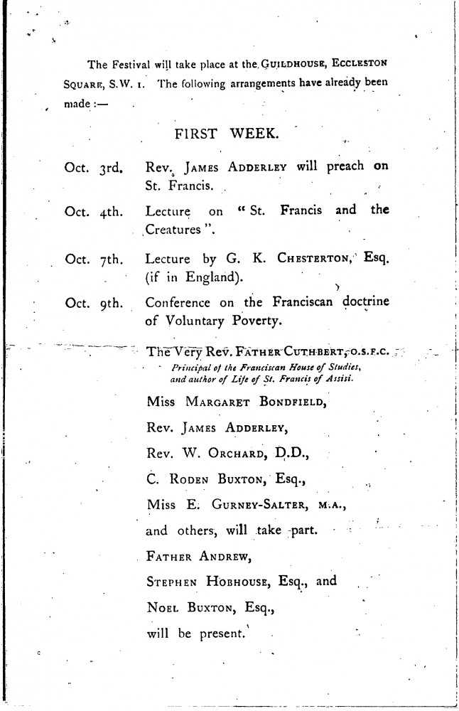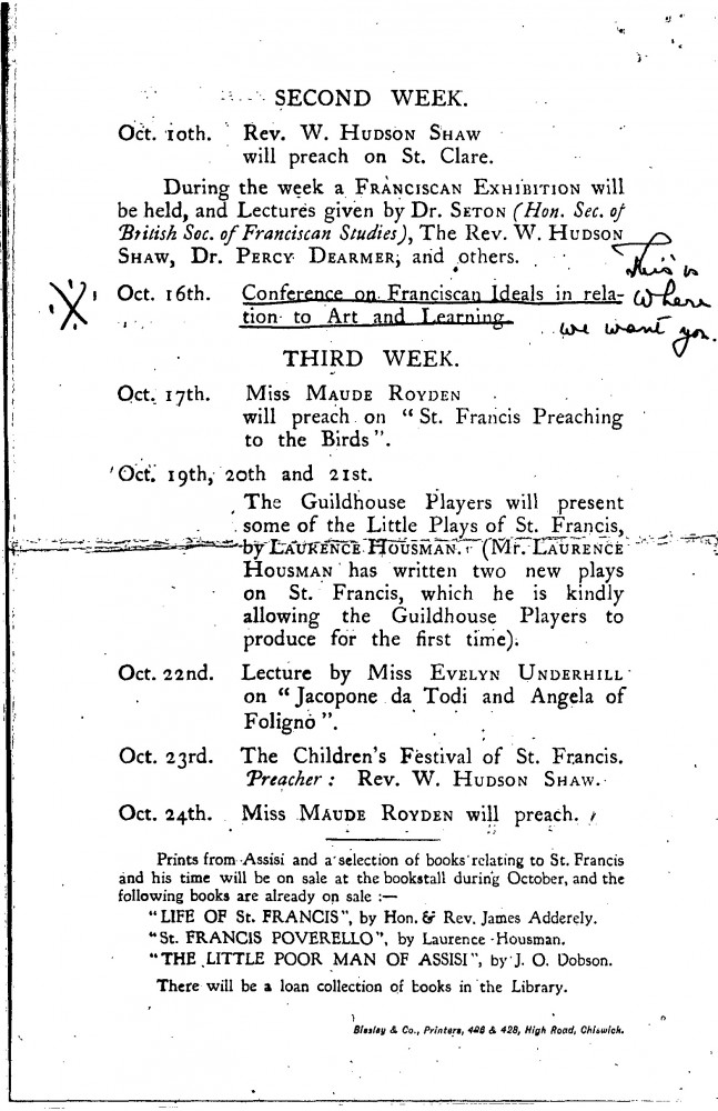 Preliminary notice and leaflet for the Guildhouse's Festival celebrating the Seventh Centenary of St. Francis of Assisi's death, which includes handwritten notes from Doctor Agnes Maude Royden, who was requesting de László's participation in the conference