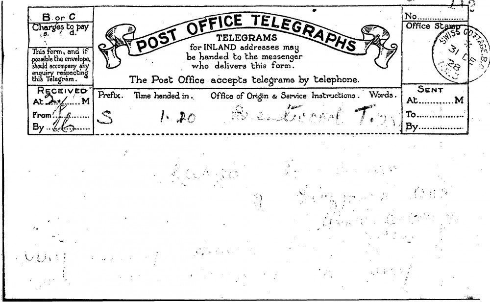 Telegram, sent from Swiss Cottage, dated 31 December 1928 [illegible content]