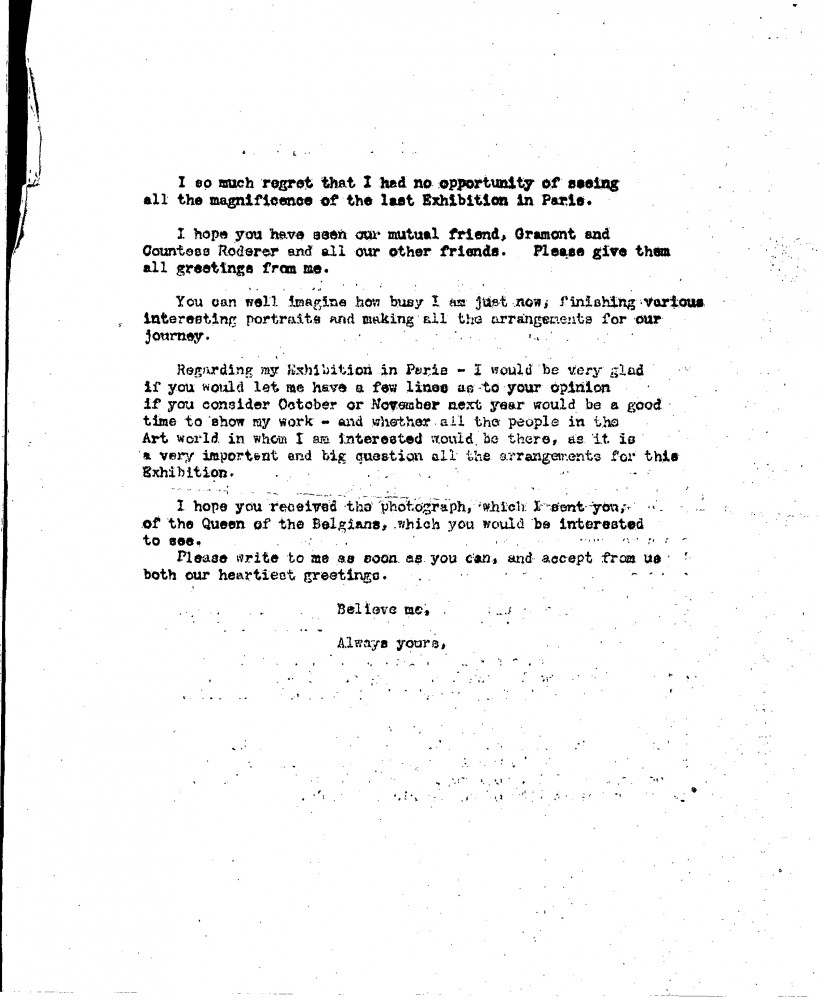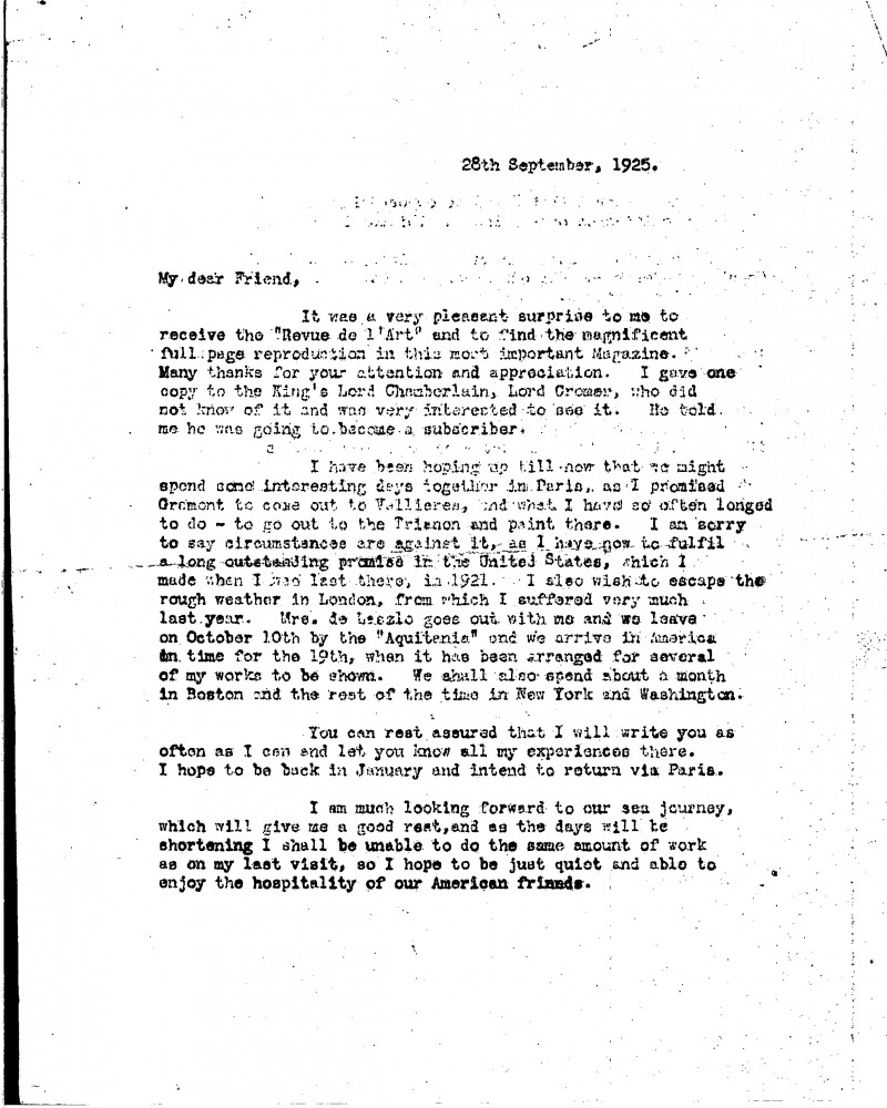 Letter from de László thanking the unidentified recipient for a copy of the "Revue de l'art", which included his portrait of Pope XI [6690]. De László had hoped to travel to Paris to paint the Trianon, but must go to America. He asks the recipient's view on holding an exhibition in October or November, 1926