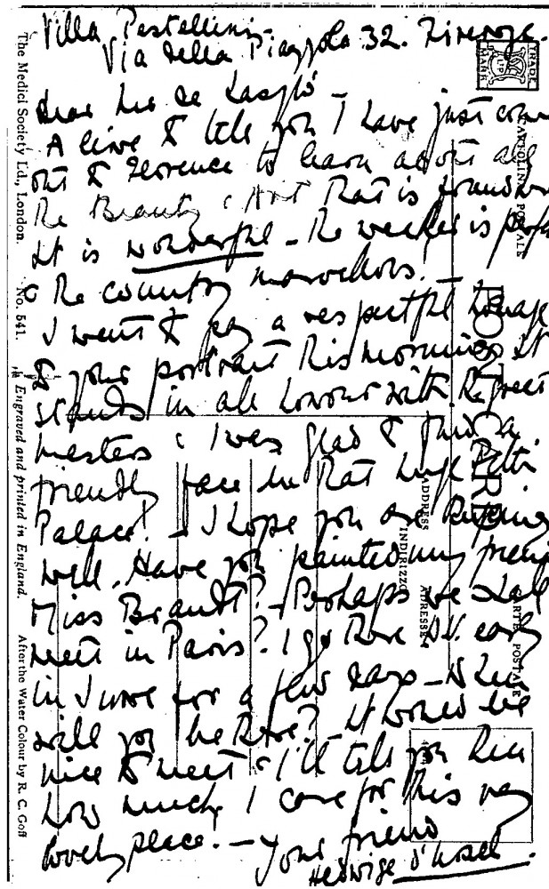 Comtesse Hedwige d’Ursel is in Florence, where she has seen de László's portrait. She asks whether he has painted Miss Brandt. Perhaps she will meet the artist in Paris
