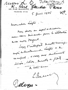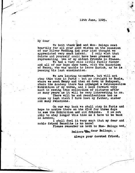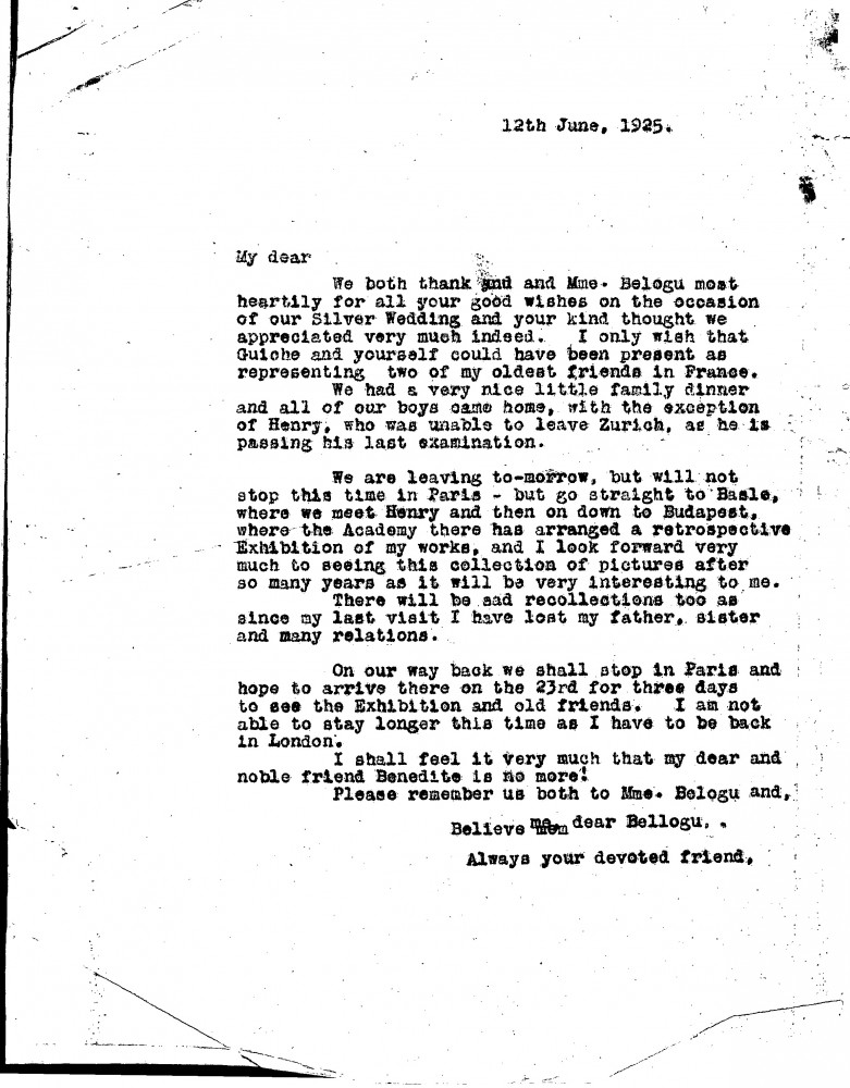 De László thanks Léon Bélugou for the silver wedding anniversary wishes. He is leaving for the Continent tomorrow, stopping in Basle and then on to Budapest for his retrospective exhibition. He intends to stop in Paris on the return journey. He mentions the recent passing of Léonce Bénédite