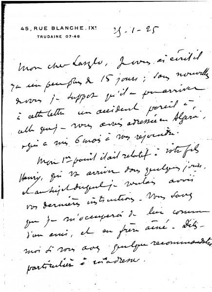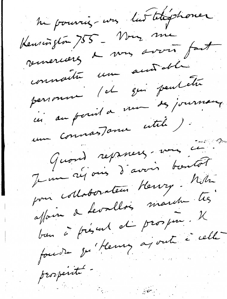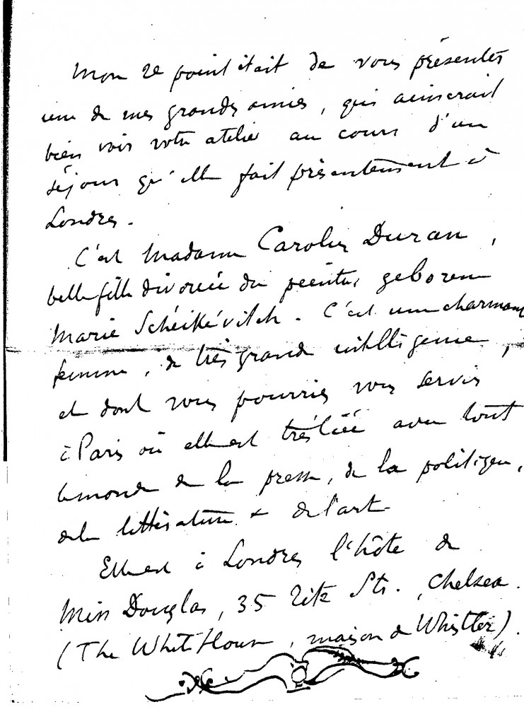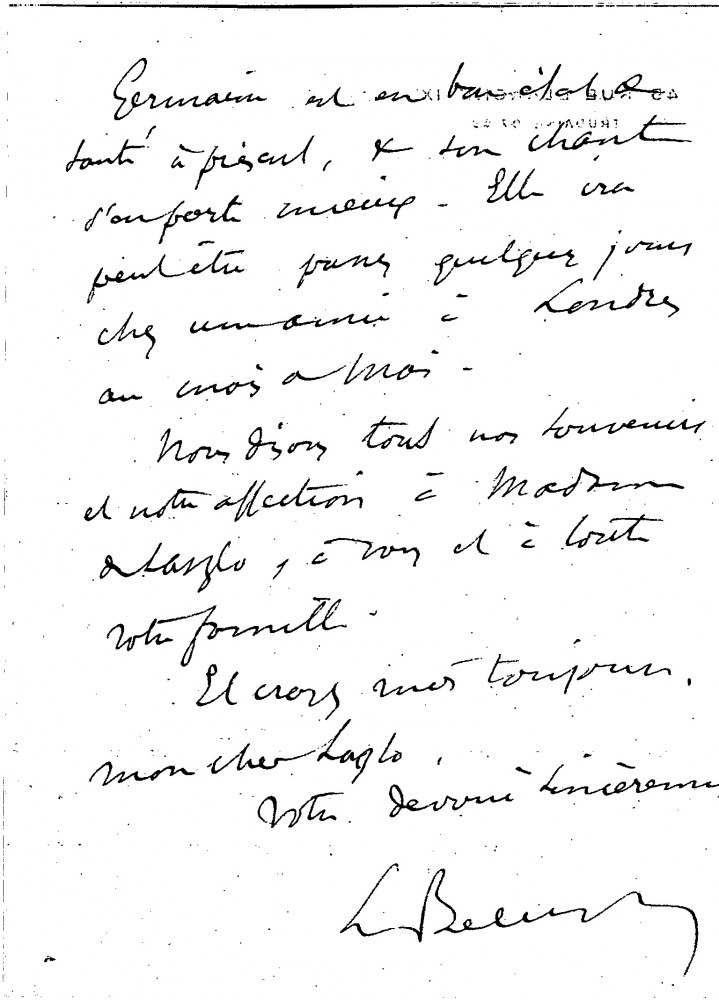 Léon Bélugou mentions the artist's son, Henry, who will shortly collaborate with the firm "Optique et Précision de Levallois" (founded by the duc de Guiche and managed by Bélugou). The well-connected Marie Scheikévitch (formerly Mrs Pierre Carolus-Duran) would like to visit the artist's studio. Germaine's health has improved