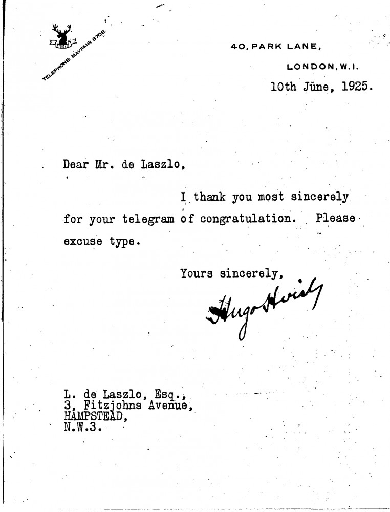 Hugo Hirst thanks de László for the congratulatory telegram (likely in relation to Hirst's creation as a Baronet in that year's Birthday Honours list)