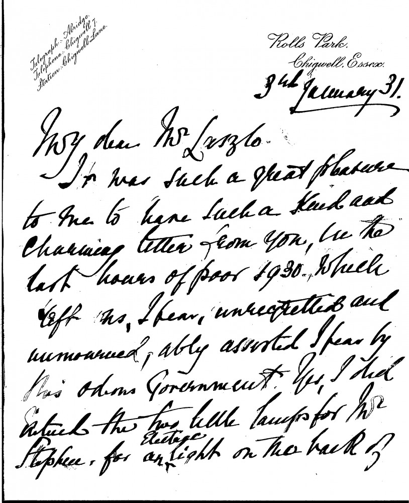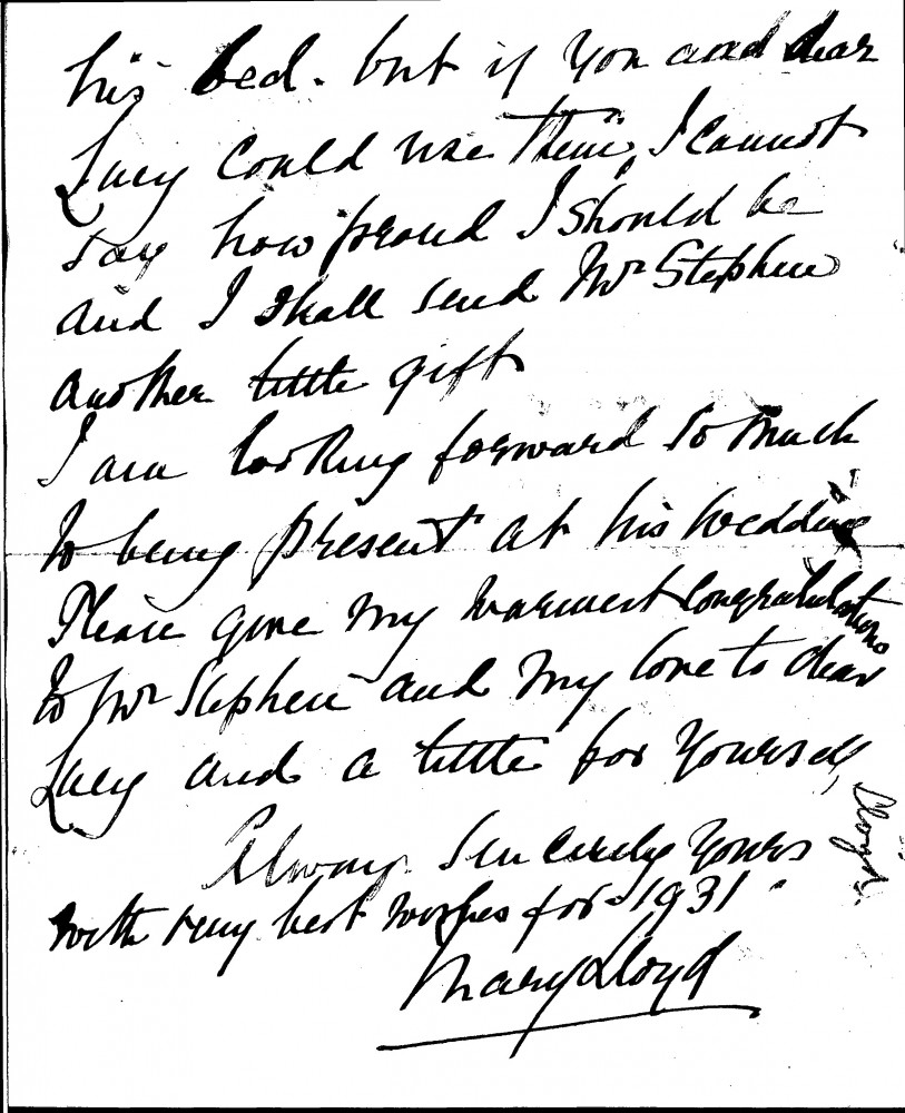 Letter from Lady Lloyd concerning a gift for Stephen de Laszlo, who was soon to be married. Letter begins with a reference to the "odious Government" of 1930