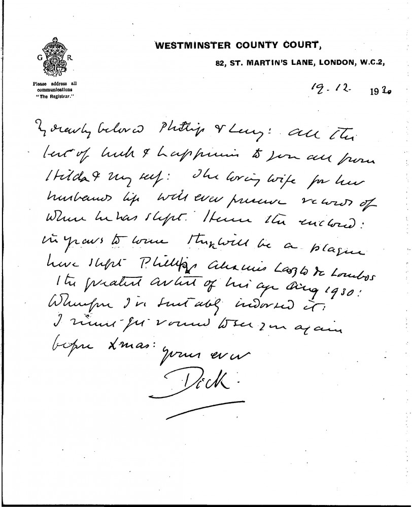 Judge Turner and his wife wish all the best to the de Lászlós for Christmas; includes the line: "here slept Philip Alexius Laszlo de Lombos the greatest artist of his age Aug 1930." (item was previously archived with DLA017-0098; DLA# has been re-used as previously contained a partial item that has since been merged with DLA017-0036, AD 18/08/21)