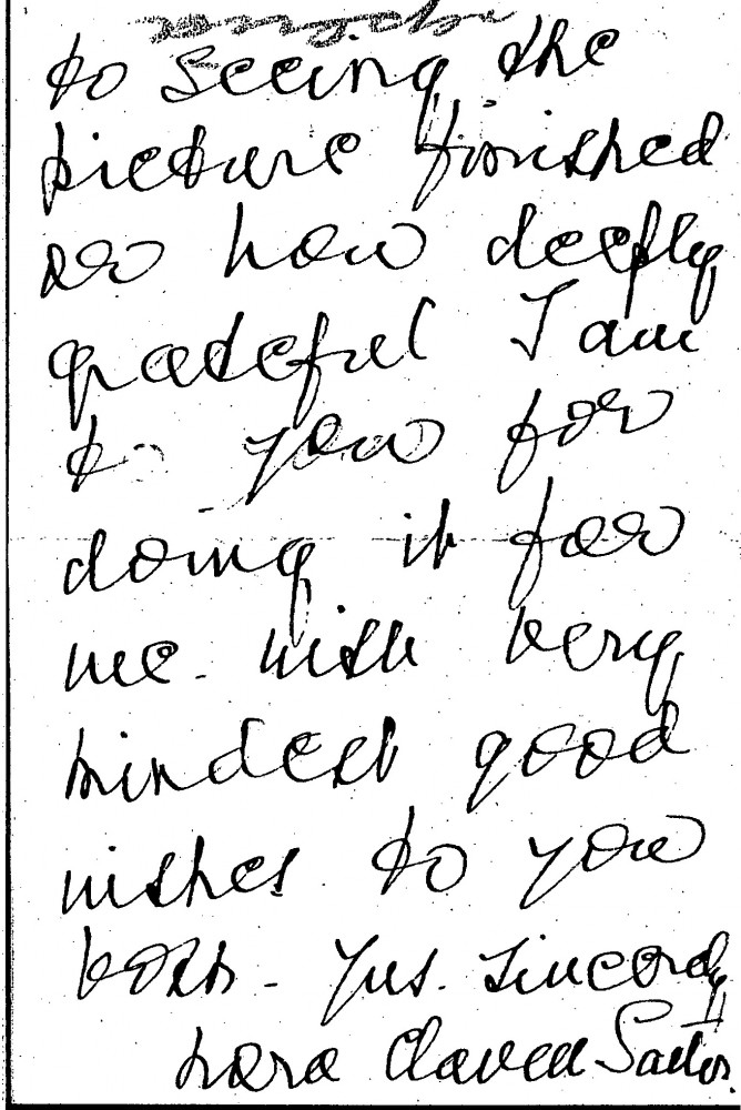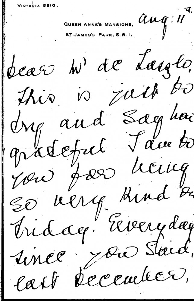 Letter from Lady Clavell Salter (dated 11 August probably 1929) thanking de László for painting a posthumous portrait of her husband [13342], which the artist had just begun